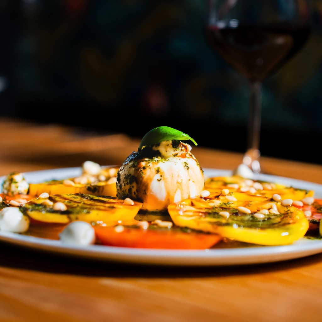Tomates du jardin, burrata, pignons de pin, basilic, huile d’olive et velouté de balsamique