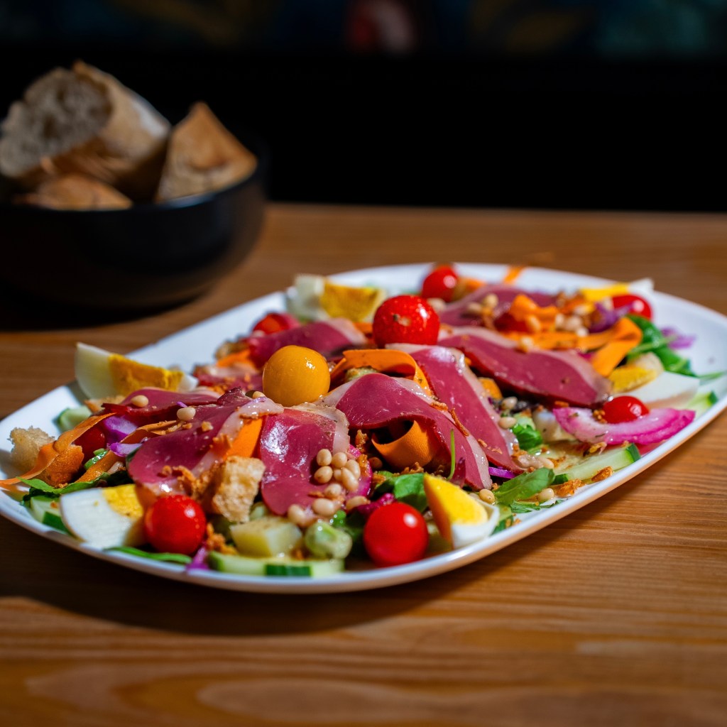 Salade mélangée gourmande, concombre, oignons, pickles, fèves de soja, chou rouge, oignons frits, tomates cerises, vinaigrette, pommes de terre, œufs, magret séché, pignons de pin