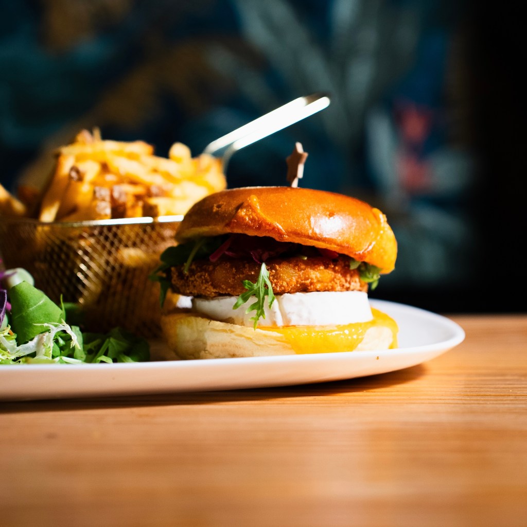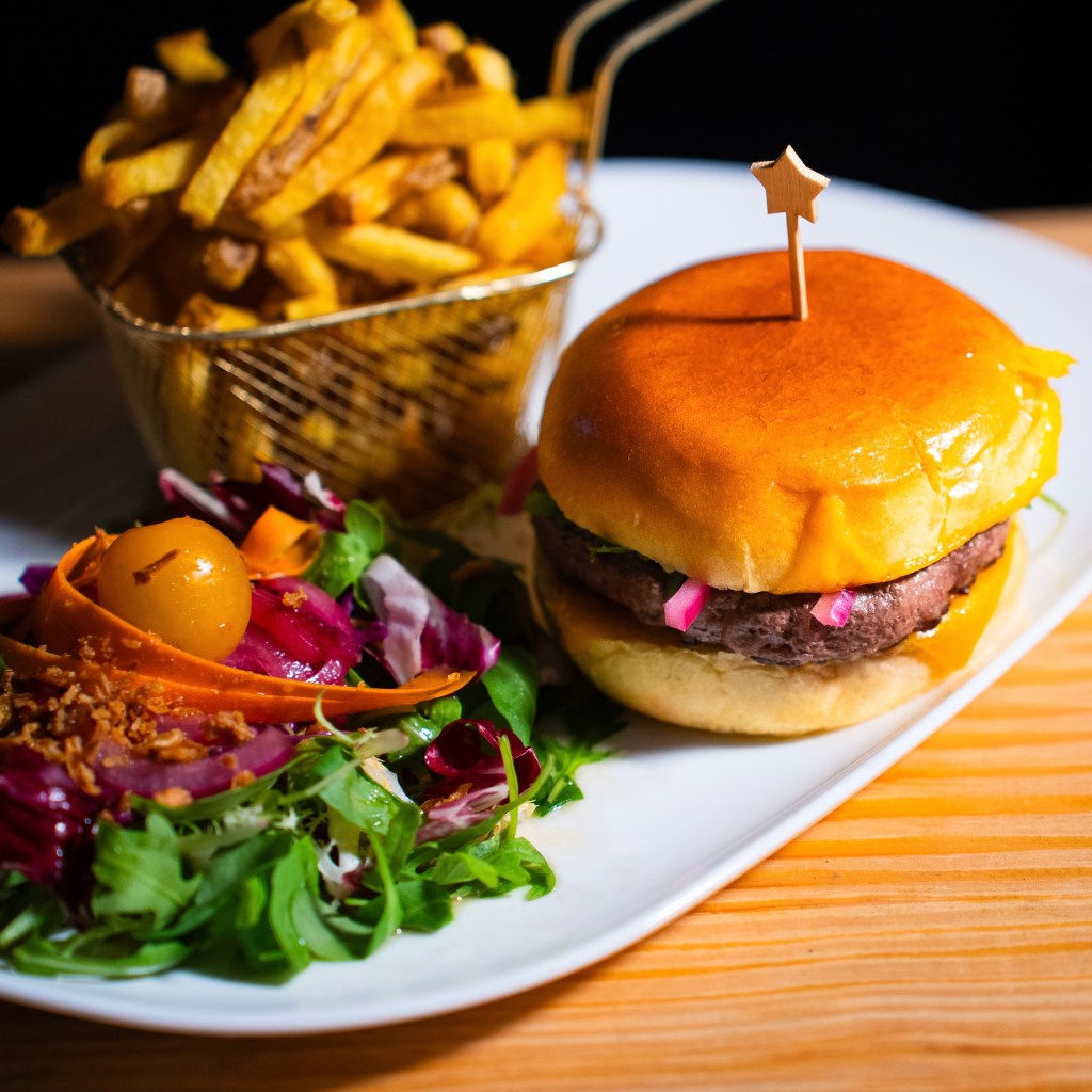 Burger, galette de pomme de terre, chèvre, crudités, frites maison et salade