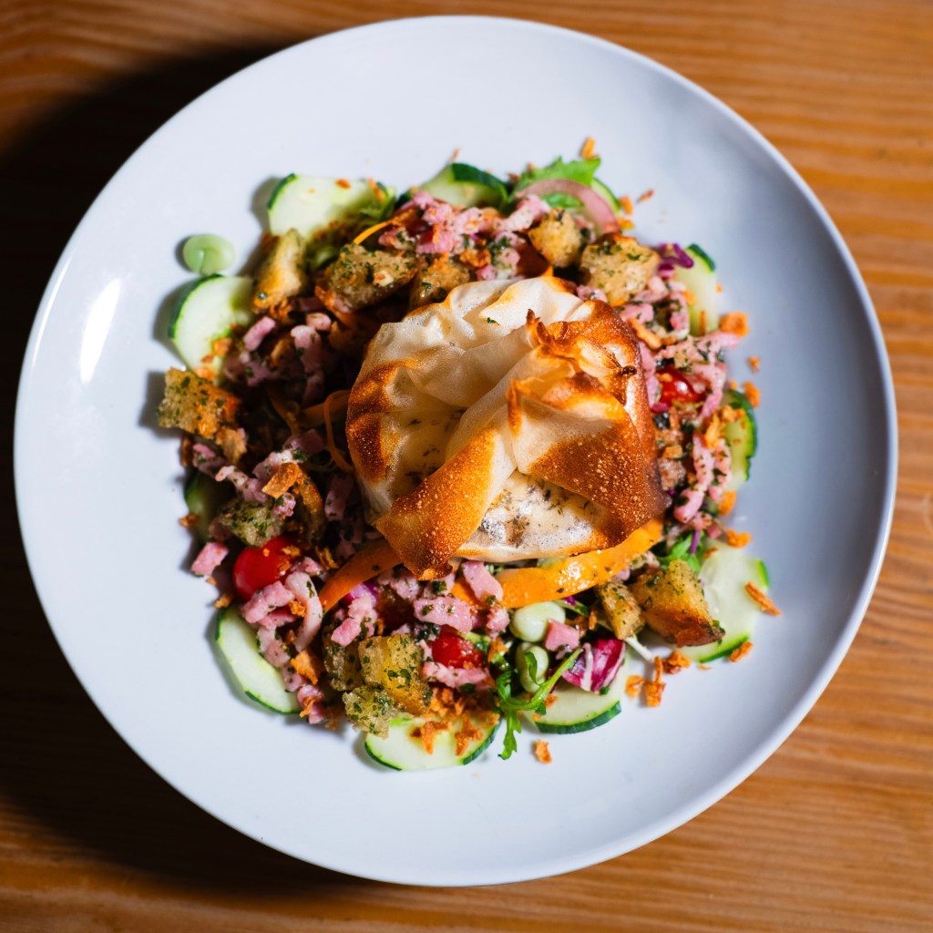 Salade mélangée gourmande, concombre, oignons, pickles, fèves de soja, chou rouge, oignons frits, tomates cerises, vinaigrette, brique de chèvre chaud miel et herbes de Provence